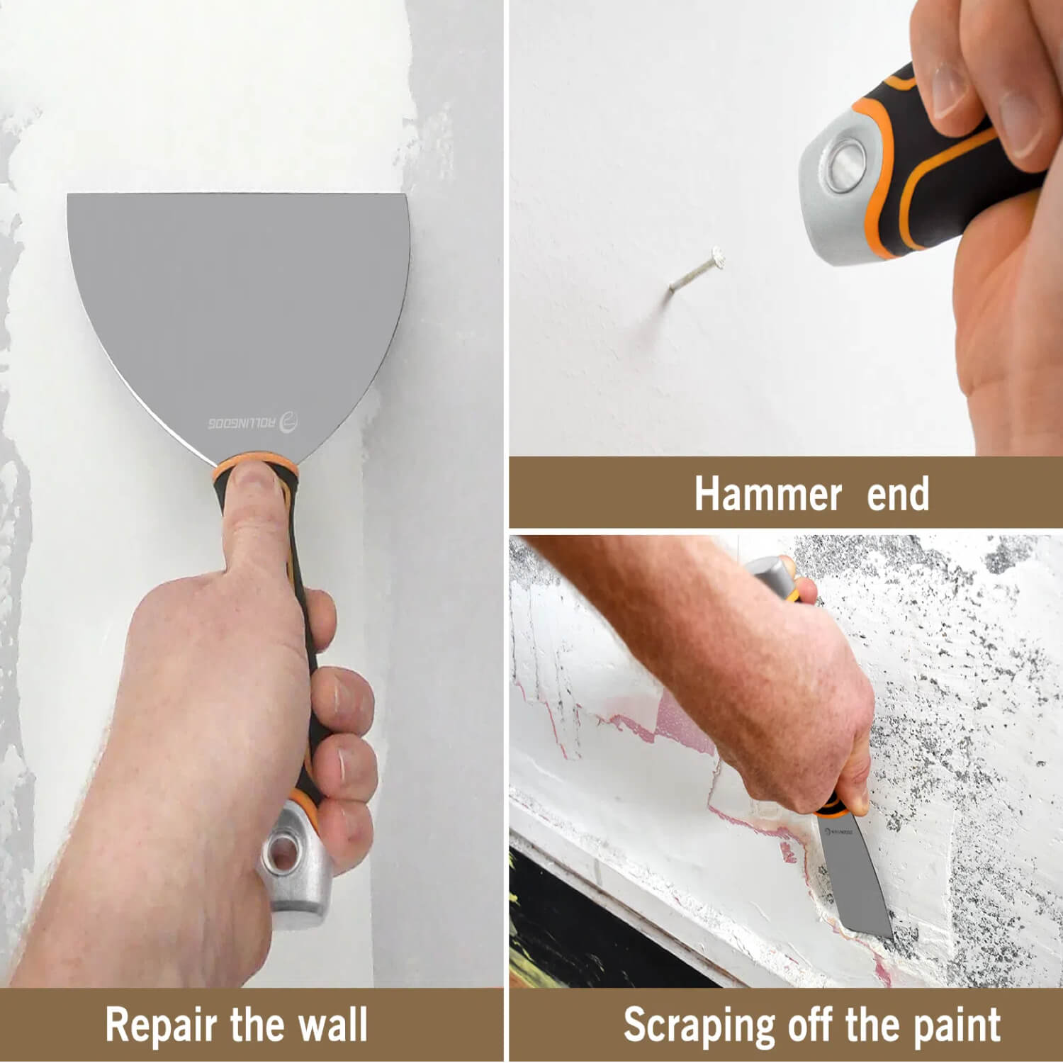 - Durable Putty Knives – Flexible 420 stainless steel blades with ergonomic rubber grips for comfort and control.