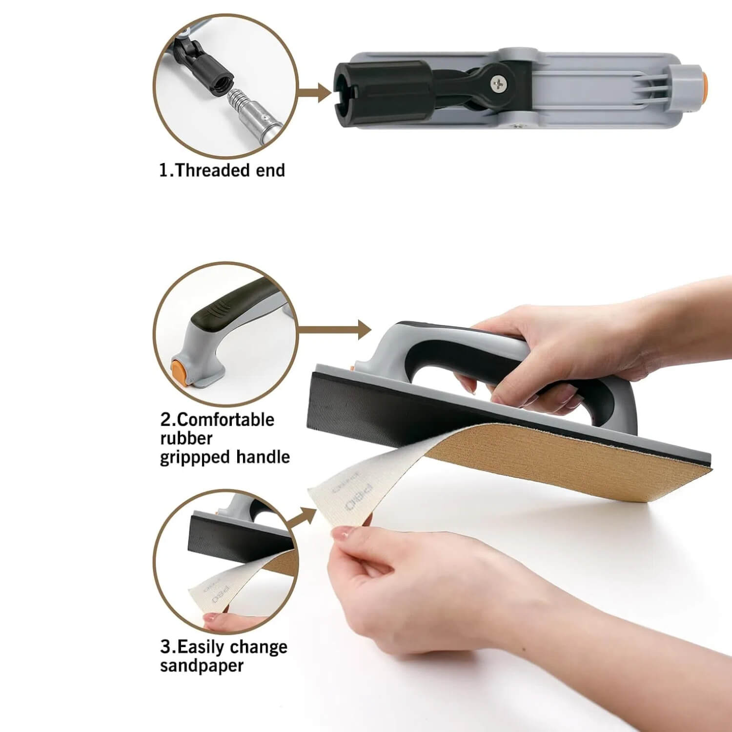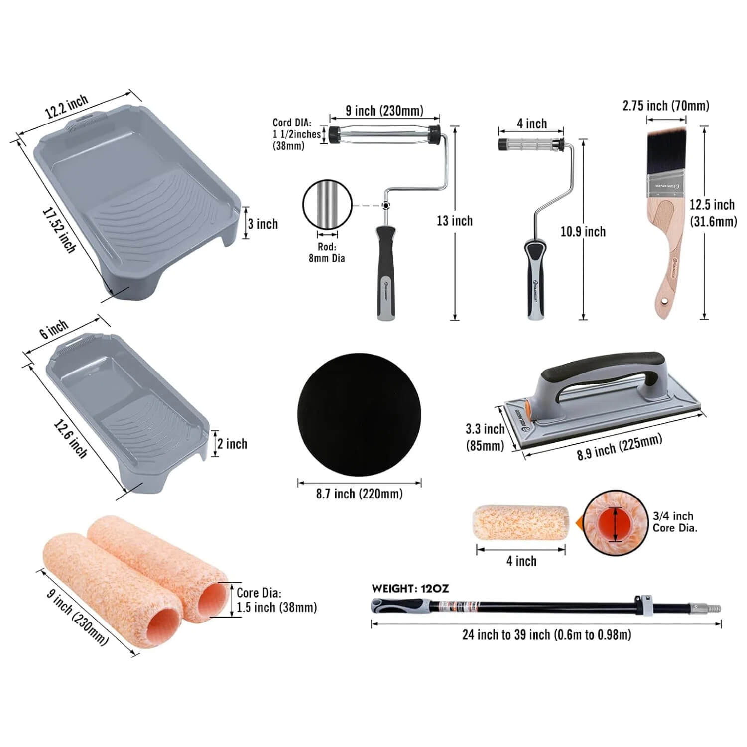• Extension Pole – Adjustable 24–39" pole with twist-lock and EVA grip works with both rollers and sanders for easy reach.